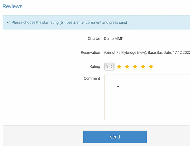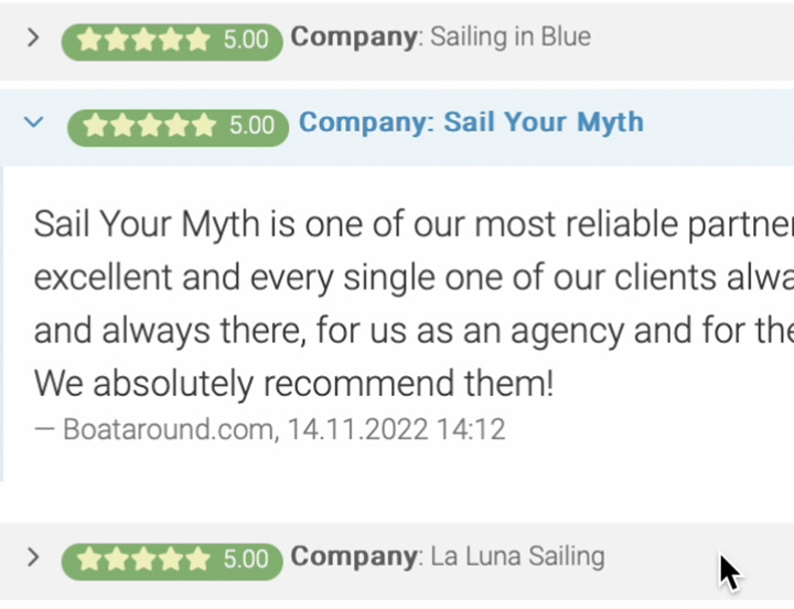 Charter Agencies can easily scroll through their bookings and create a Pro review for any completed reservation but also recommend the charter company in general. Communicate your satisfaction with the cooperation using the star system and by leaving a comment.
